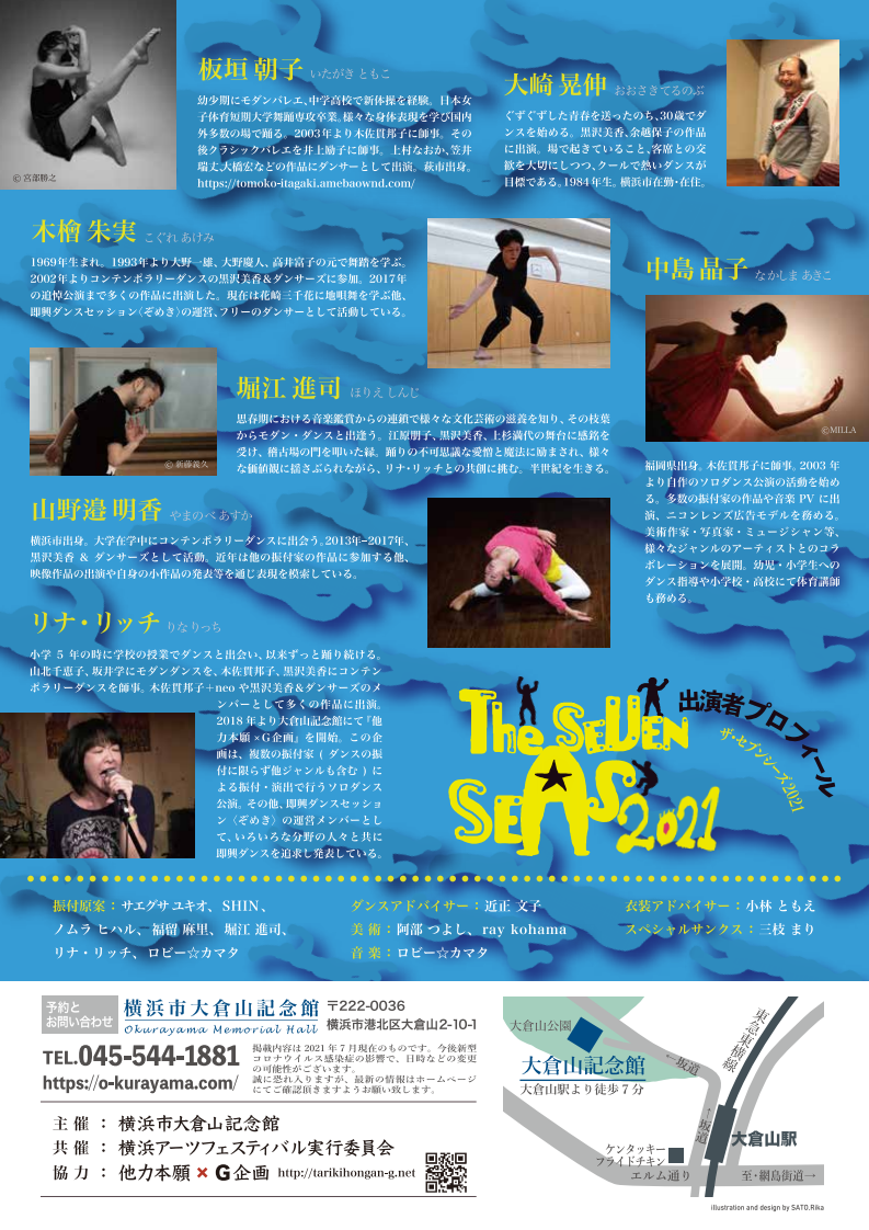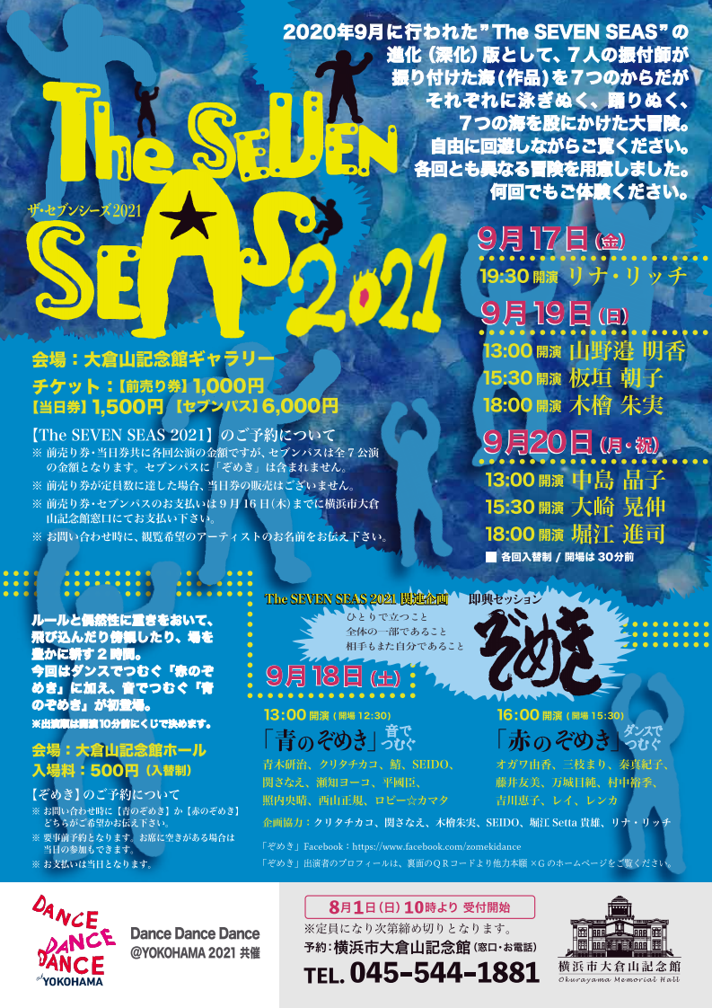 内容:『The SEVEN SEAS』は、7人の振付家が振り付けた7つの海をリナ・リッチがひとつの大きな海として泳ぎぬく、踊りぬく、7色の海を股にかけた大冒険です。お客様には、通常公演のように客席からではなく、お好きなところへ移動しながら踊りに立ち会っていただくという形態をとっています。皆様と一緒に海の旅を楽しむことができれば幸いです。
